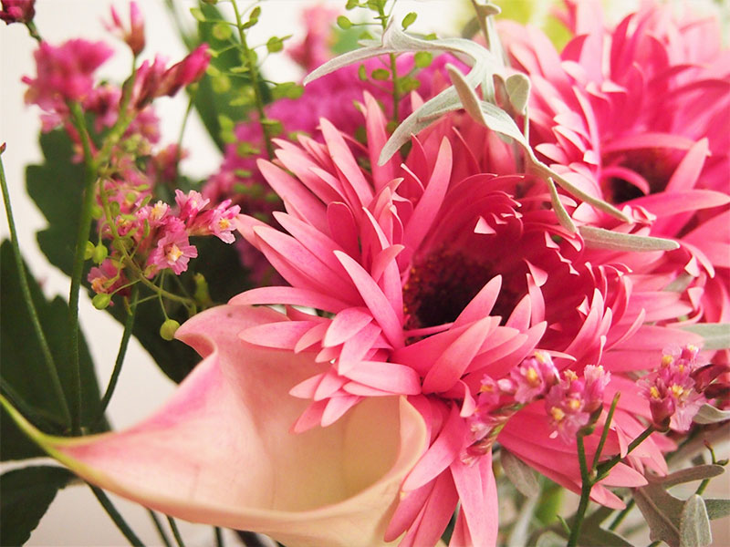 ハナ清では様々な種類の花が調和し、引き立て合う花束やアレンジメントフラワー、スタンドフラワー等、バラエティ豊富に取り揃えた新鮮なお花でお作りしてます。